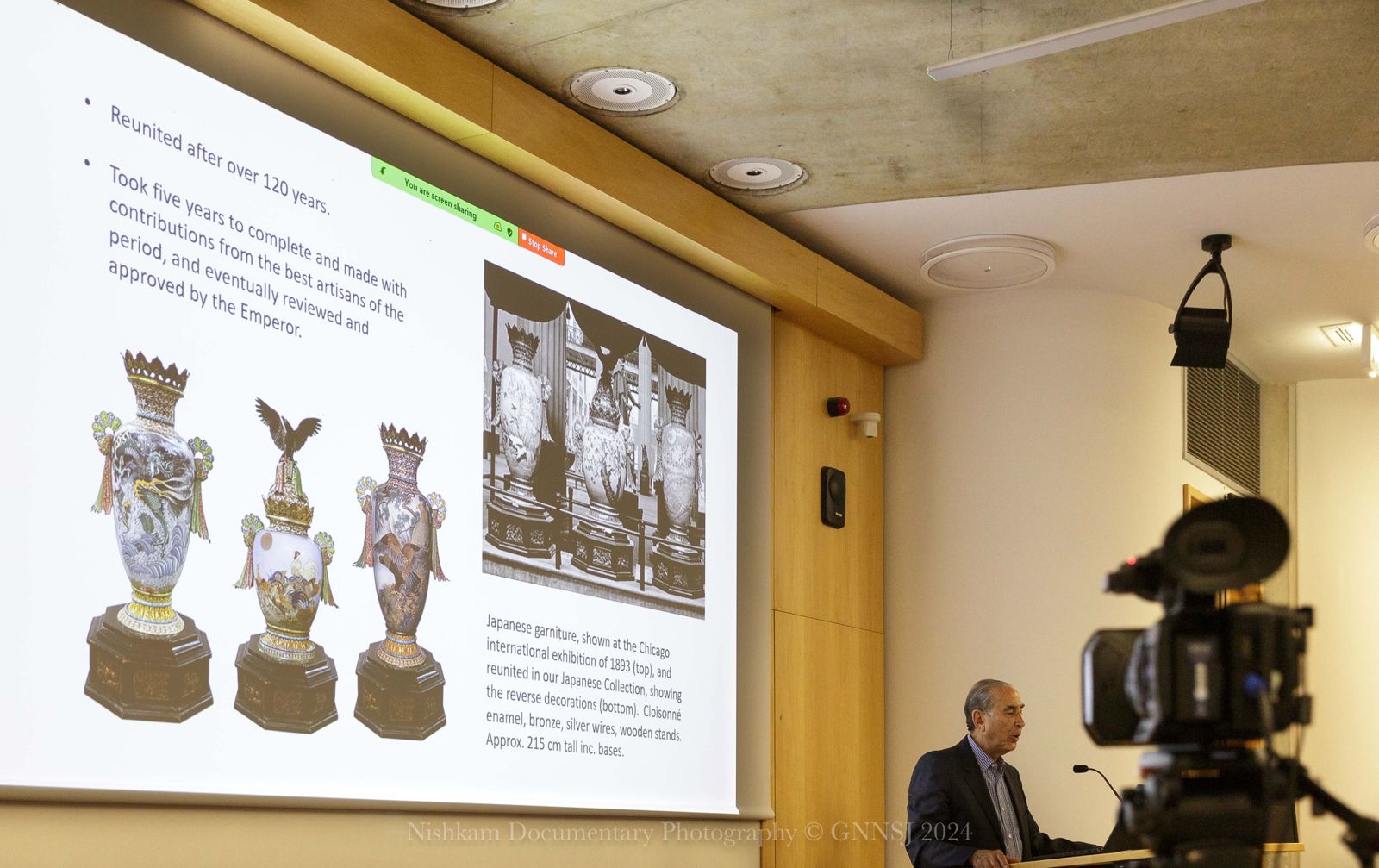 He gave examples of objects from the Khalili Collections, including a 13th century Persian miniature depicting Abrahamic unity, a 15th century Judeo-Arabic astrolabe showing cross-faith collaboration and Japanese Meiji period vases first shown at the 1983 World’s Columbian Exposition in Chicago.